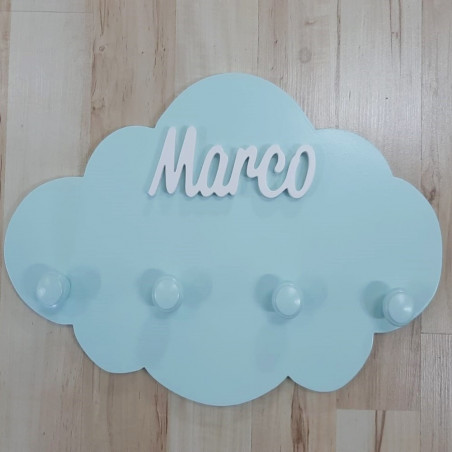 Perchero de madera personalizado en forma de nube y con el nombre que prefieras. Lo pintamos en el color que más te guste. Ideal para los dormitorios de los peques de la casa.