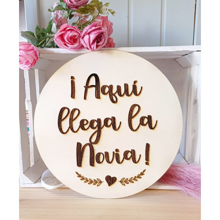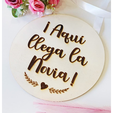 Cartel ideal para anunciar la llegada de la novia a la ceremonia. Está hecho en madera natural y lleva un grabado con láser sobre la misma. Además siempre le ponemos una cuerda a juego para poder llevarlo colgado.
