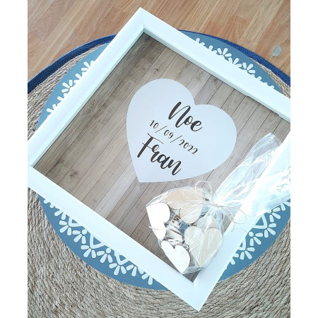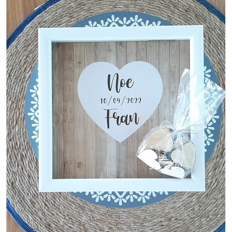Cuadro de firmas personalizado, perfecto para que tus invitados dejen un mensaje especial en el día de tu boda. En la parte superior lleva una ranura tipo hucha para poder introducir los corazones firmados. Una vez finalizado el evento, tendrás un recuerdo para decorar tu hogar y recordar los mejores momentos de ese gran día.