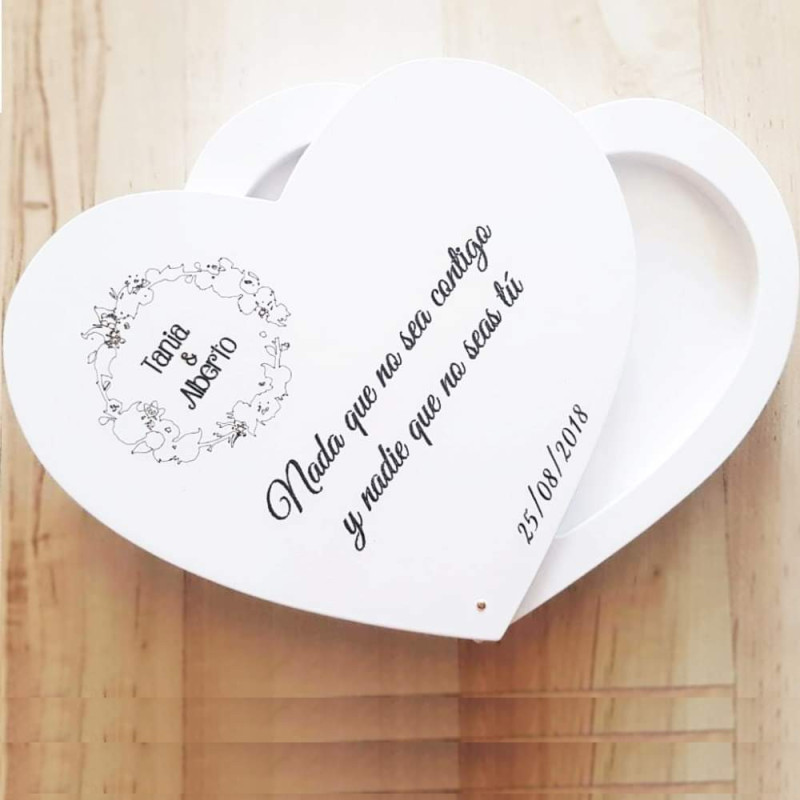 Porta arras de madera, totalmente personalizable tanto en texto como en forma y color. Crea un artículo a tu medida, especial para las arras de tu boda, el cual además, podrás conservar como recuerdo e incluirlo en la decoración y en el día a día de tu hogar. Podrás utilizarlo como joyero o cajita para seguir guardando recuerdos especiales.